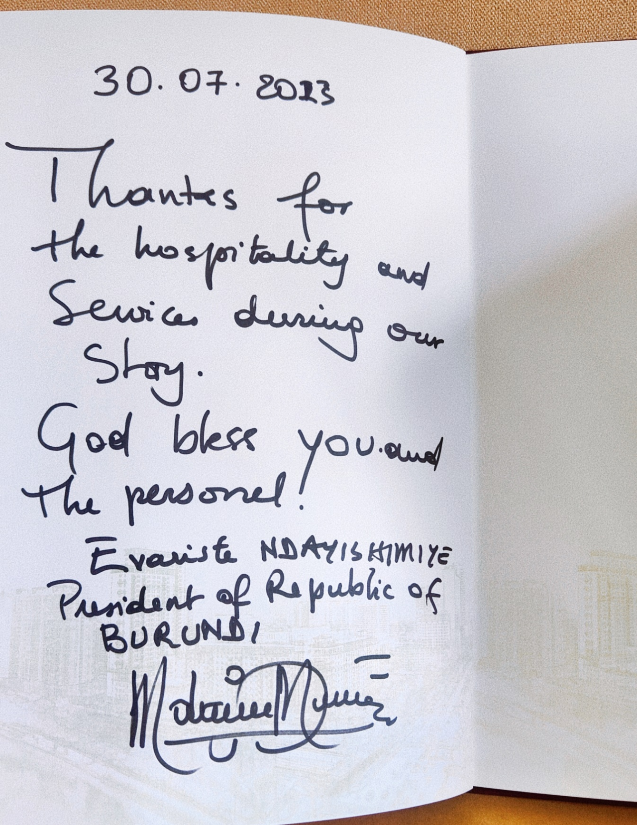 國家領導人及夫人離館之際,在金牛賓館親切問候了賓館以黨科同志為代表的服務保障團隊成員,表達了對川菜的喜愛,夸贊川菜“巴適”,并表示在金牛賓館可以享用到正宗的川菜,稱贊金牛賓館是有傳統(tǒng)的賓館。布隆迪總統(tǒng)恩達伊施米耶在錦江賓館留言簿上留言,表示了對錦江賓館此次接待的感謝,并與接待人員合影留念。